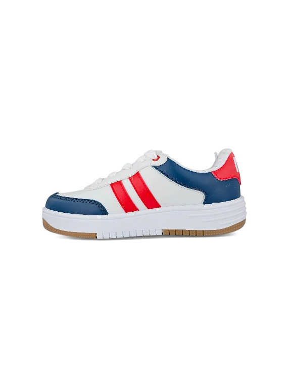 - Capellada en sintético color blanco con puntera y talonera sobrepuesta en color azul oscuro, contrafuerte color rojo brindando mayor protección y alargando su duración, detalles en color rojo en ambas caras del tenis y cordonera en color blanco brindando un estilo casual.