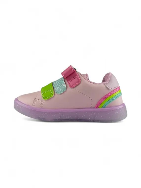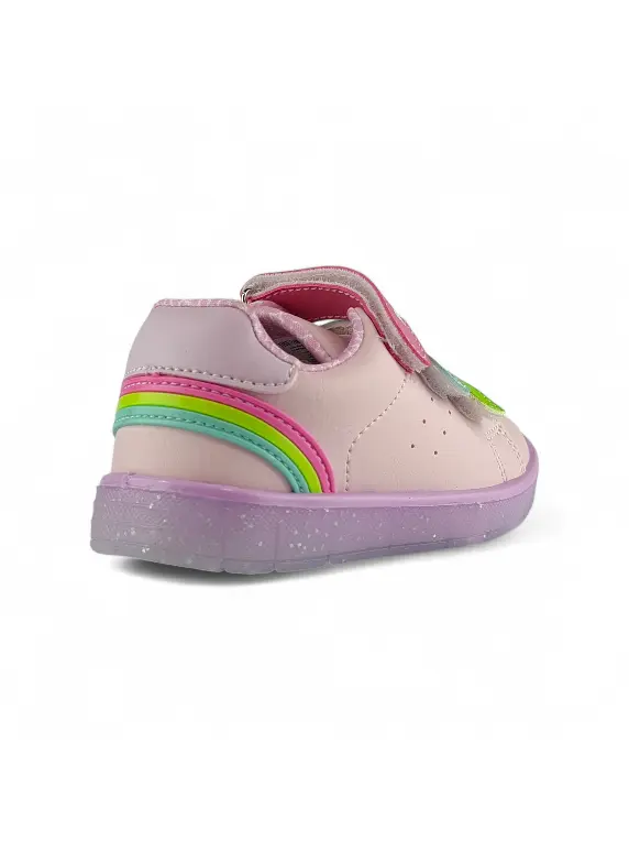 - Capellada en material sintético color rosado, con refuerzo en el contrafuerte color lila y un hermoso detalle sobrepuesto en goma en la talonera que forma un arcoíris.