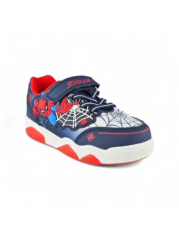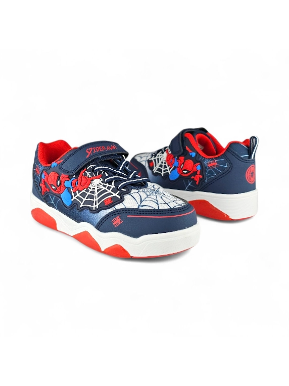 - Capellada color azul con detalles grabados semejando las telarañas, con puntera y talonera sobrepuestas que brindan mayor protección y alargan su duración. Imagen en relieve tipo goma de la telaraña e imagen de Spiderman en la cara externa del tenis.